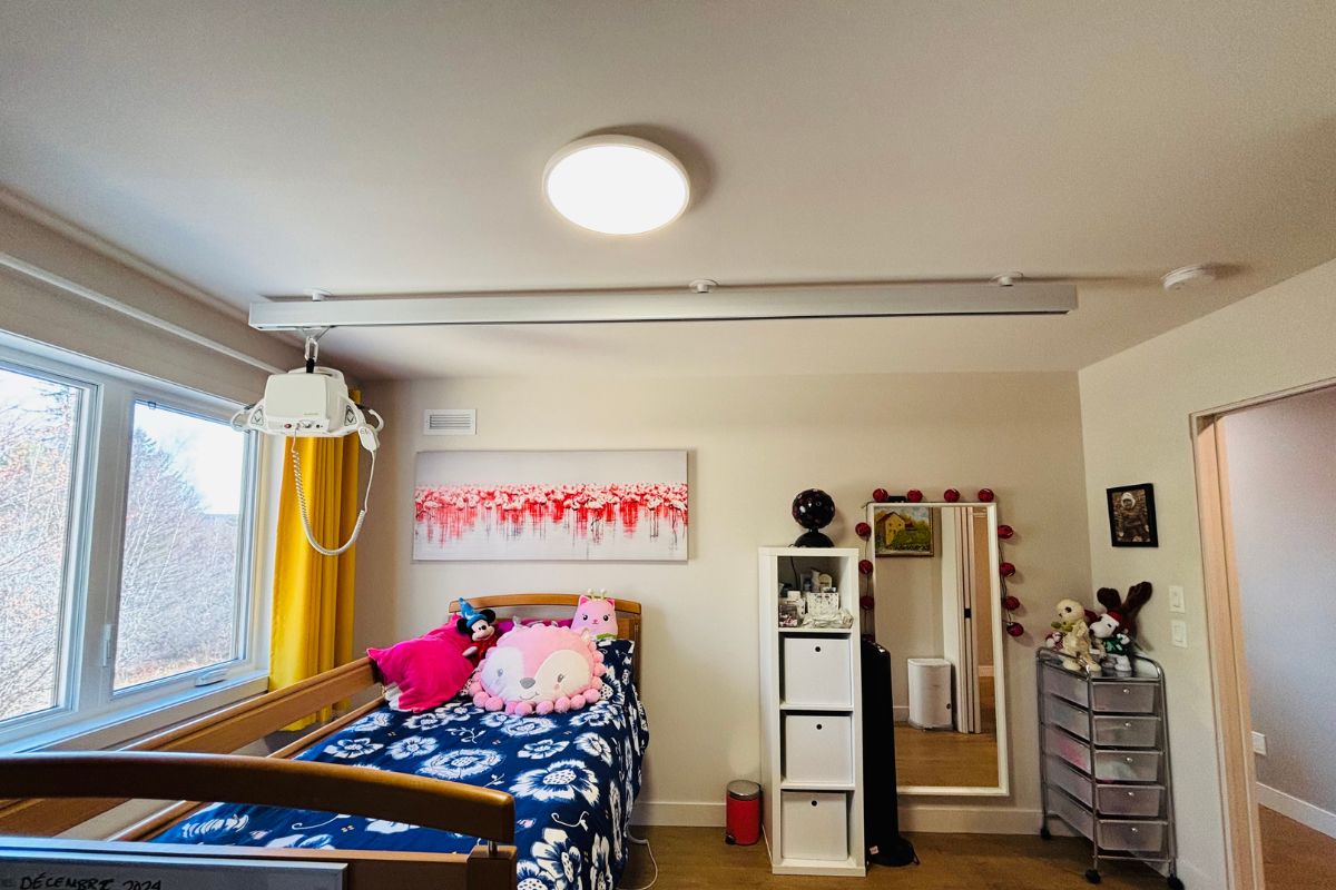 Maison unifamiliale adaptée avec ascenseur, espace ergonomique à la cuisine et dans la salle de bain avec grande douche à l’italienne. Il s’agit du modèle Le Mathéo, un jumelé transformé en maison unifamiliale et entièrement adaptée aux besoins de cette famille de Sherbrooke.